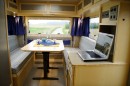 Bimobil AX 575 – Die Drehschemel-Vorrichtung bedingt den etwas erhöhten Einbau der Frontsitzgruppe, diese bietet mit gutem Rundblick auf den gegenüberliegenden Sitzbänken mit 155 Zentimetern Breite Platz für sechs Personen. Ordert der Kunde die große, optional lieferbare Frontklappe, mutiert die Sitzgruppe zum Freisitz. Durch Absenken des Hubtisches lässt sich die Sitzgruppe zum Bett (Liegefläche 150 x 210 Zentimeter) umbauen. Der von außen befüllbare Frischwassertank ist in einem der beiden Sitzkästen untergebracht. Im zweiten sind die Elektrik sowie die Heizung installiert, gleichwohl verbleibt noch nutzbarer Stauraum. Foto: Auto-Medienportal.Net/Bimobil