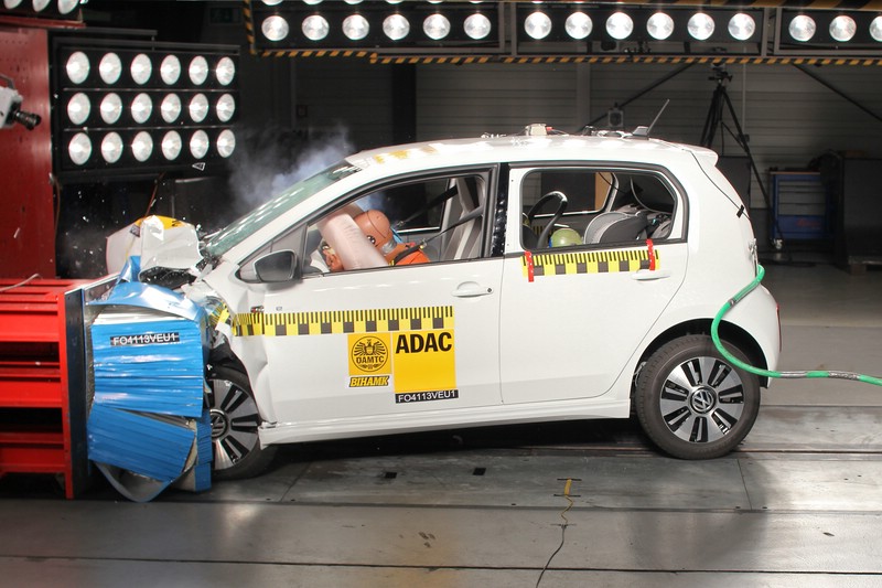 Der rein elektrisch angetriebene Kleinwagen VW e-up! erweist sich als ein Großer beim ADAC Crashtest und Umweltranking. Über 250 Kilogramm schwerer und mit einer Hochvoltstrom-Batterie bestückt, zeigt er sich genauso sicher wie sein konventionell gebauter Bruder, der VW up!. 2011 hatte der ADAC bereits den mit einem Verbrennungsmotor ausgestatteten VW mit einem sehr guten Crashergebnis getestet.