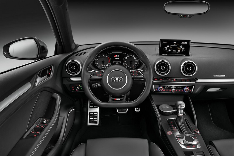 Audi S3 Sportback – Das optionale Multifunktions-Sportlederlenkrad hat einen unten abgeflachten Kranz. Pedale und Fußstütze sind aus gebürstetem Aluminium. Foto: Auto-Medienportal.Net/Audi