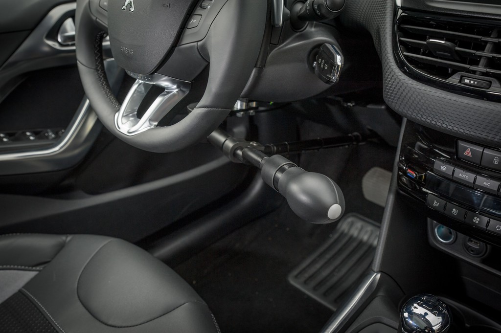 Peugeot 2008 für den Rollstuhlfahrer: Um Gas zu geben, zieht der Fahrer den Regler seitlich heraus. Möchte er bremsen, drückt er das Gerät nach vorn. Möglich wird dies durch eine direkte Verbindung mit dem Bremspedal. Foto: Auto-Medienportal.Net/Peugeot