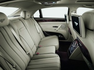 Bentley Flying Spur – In den vorderen Kopfstützen befinden sich für die hinteren Mitfahrer 10-Zoll-Monitore auf denen sie dank einer in die Mittelarmlehne eingefassten Touchscreen-Fernbedienung bequem Office-Tätigkeiten ausführen können. Foto: Auto-Medienportal.Net/Bentley