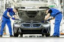 Blick in die Montage des Hybrid-Sportwagens BMW i8 im Werk Leipzig. Endmontage. Anbau Motorhaube.