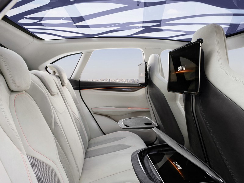 BMW Concept Active Tourer: In die Rückseite der Vordersitze ist jeweils eine zentrale senkrechte Metallschiene integriert. An diesem Clip-System lassen sich Klapptische mit zahlreichen komfortablen Verstellmöglichkeiten befestigen oder zusätzliche Verstautaschen einhängen. Besonders komfortabel ist so die flexible Nutzung aller gängigen Tablet-Computer von den Rücksitzen aus. Foto: Auto-Medienportal.Net/BMW