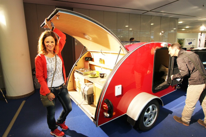 Alles, was dafür nötig ist, befindet sich an Bord. Zwei bequeme Schlafplätze und hinter der weit aufschwingenden Klappe im Heck des Caravans sind untergebracht: ein zweiflammiger Gaskocher, ein Wassertank samt Pumpe und Spülgelegenheit, ein Solar-Modul zum Aufladen der bordeigenen Akkus und ein 230-Volt-Stromanschluss zur Versorgung des Kühlschranks sowie der TV/DVD- und der HiFi-Stereoanlage.