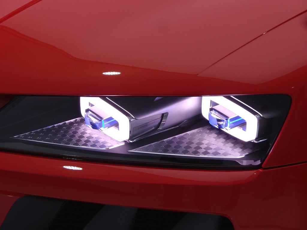 Audi Quattro Sport Laser Light Concept: Im Inneren der Scheinwerfer sind je zwei flache, trapezförmige Körper zu erkennen. Der äußere generiert über Matrix-LEDs und eine Blende das Abblendlicht, der innere das Laser-Fernlicht. Foto: Auto-Medienportal.Net
