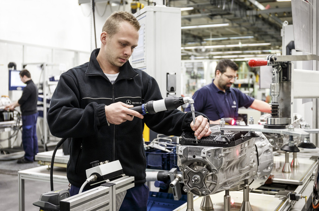 Ferienbeschäftigte arbeiten auch in der Montage des neuen Automatikgetriebes 9-G-Tronic im Mercedes-Benz-Werk Untertürkheim.