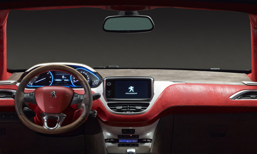 Peugeot 2008 Castagna: Das zum Teil rot überzogene Armaturenbrett ist mit handgenähten weißen Kreuznähten verziert, verschiedene Brauntöne finden sich Richtung Mitteltunnel. Foto: Auto-Medienportal.Net/Peugeot