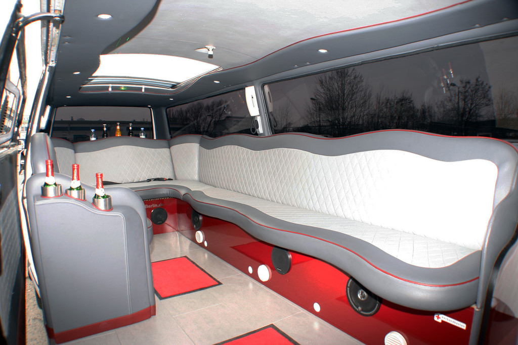 Eine lange Karosserie macht noch keine Stretch-Limo, weshalb der 36-jährige und seine Mitstreiter nicht weniger Energie in den Innenausbau steckten. Weiß, grau und rot sind die dominierenden Farben im üppig mit Leder ausgeschlagen rollenden Partyraum. Mehrere Getränkekühler fehlen ebenso wenig wie ein 47-Zoll-LED-Bildschirm, mit dem sich auf vielfältige Art für Unterhaltung sorgen lässt. Die groß dimensionierten Bass-Lautsprecher sind von den Gästen zwar nicht zu übersehen, vieles an High-Tech ist aber versteckt installiert. Die Endstufen der 7600-Watt-Soundanlage erblickt nur, wer die Heckklappe öffnet. Und um die Lasershow richtig genießen zu können, muss es dunkel draußen sein.