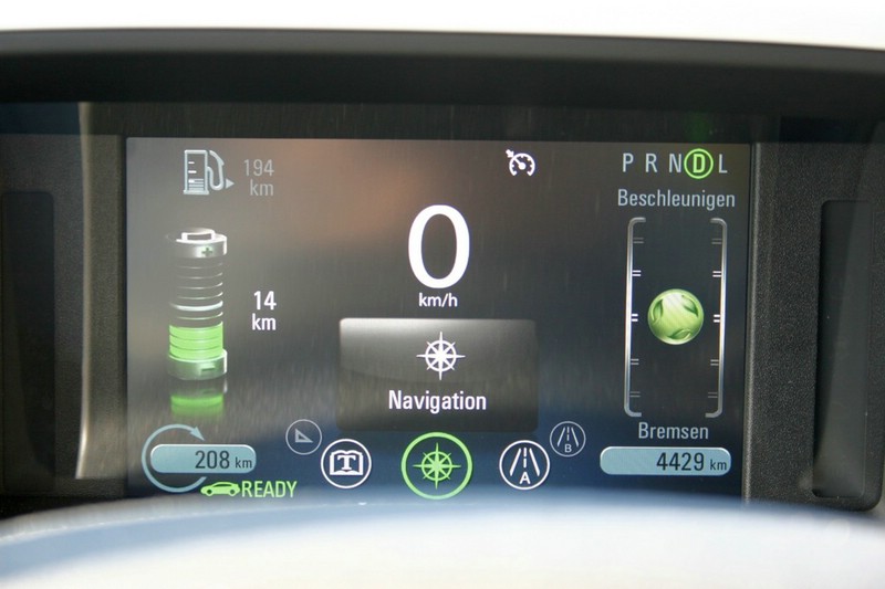 Chevrolet Volt – Die gefälligen Anzeigen könnten durchaus auch gerne in Fahrzeuge mit konventionellem Antrieb übernommen werden. Dazu gehört beispielsweise das „Ecometer“ in Form eines grünen Balls, der bei ökonomischer Fahrweise in der Mitte in einem Kreis bleibt. Beim Beschleunigen „hüpft“ er nach oben, wird kleiner, wechselt die Farbe von grün nach gelb und verliert seine Blättersymbole. Warum das im umgekehrten Fall allerdings genauso funktioniert, verwundert dann doch etwas, denn schließlich gewinnt der Volt beim Bremsen Energie. Foto: Auto-Medienportal.Net