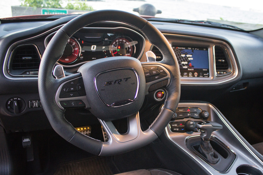 Dabei kann der Challenger Hellcat mit der Leistung gut umgehen – sofern man sie eben auf die Straße bringt. Das Fahrwerk, das in seinen Grundzügen noch von der Mercedes-Benz E-Klasse aus den 90er-Jahren abgeleitet ist, wurde massiv versteift. Und für den Hellcat hat Dodge noch einmal die hydraulische Servolenkung ausgepackt, während bei den schwächeren Varianten eine elektrische Servolenkung verbaut wird. Unter den schwarzlackierten 20-Zoll-Felgen steckt eine bissig zupackende Hochleistungs-Bremsanlage.