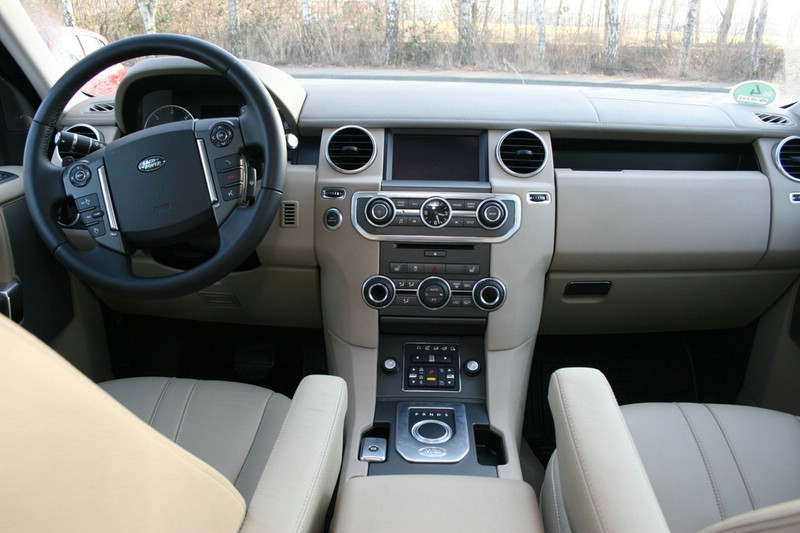 Land Rover Discovery – Im gesamten Fahrgastraum kommt ein typisch britisch luxuriöses Ambiente mit naturbelassenen Hölzern und sorgfältig gearbeitete Nähten und Abdeckungen für das Armaturenbrett, die Türverkleidungen und die Mittelkonsole. Dies geht keineswegs zu Lasten der Funktionalität der Bedienelemente, die sich in der Regel auf Anhieb dem Fahrer erschließen. Foto: Auto-Medienportal.Net