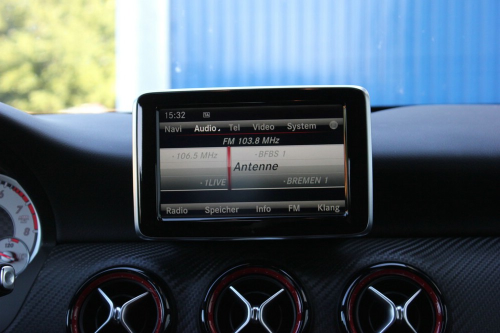Mercedes-Benz A 250 Sport – Einen Extra-Blick lohnt das Display für Infotainment auf der Mitte des Armaturenbretts. Es hat die Form und fast die Größe eines kleinen iPads und zeigt damit, wohin die Reise bei der Vernetzung mit dem Internet möglicherweise geht: Das iPad wird eine wichtige Rolle spielen, zumindest als Vorbild, wenn nicht als integrierbarer Rechner. Foto: Auto-Medienportal.Net