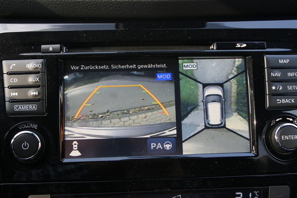 Trotz der per se höheren Sitzposition nimmt der Fahrer subjektiv auf niedrigem Gestühl Platz. Dieses Gefühl rührt von der hohen Schulterline der Fahrgastzelle und den relativ schmalen Fenster. So wirkt der X-Trail doch ein wenig unübersichtlich und es wundert kaum noch, dass hinter der mächtigen A-Säule in Kurven auch schon einmal ein entgegenkommender Van für den Bruchteil einer Sekunde komplett aus dem Sichtfeld verschwindet. Ebenso steht die D-Säule beim Blick nach schräg hinten im Weg. Aber zum Glück gibt es bei Nissan den „Around View Monitor“ (1250 Euro) mit 360-Grad-Kamera und Draufsicht.