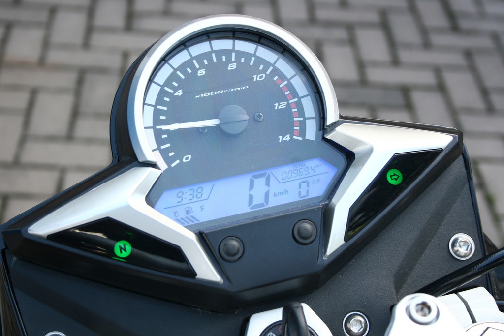 Als erfreulich festzuhalten bleibt die erstaunliche Vibrationsarmut des kleinen wassergekühlten Achtel-Liter-Triebwerks. Die Bremsleistung ist ordentlich und vermittelt eine gute Rückmeldung, die hintere Scheibe ist in dieser Fahrzeugklasse nicht selbstverständlich. Vorne gibt es sogar eine doppelte Bremse im Wave-Design mit stolzen 300 Millimetern Scheibendurchmesser. Auch die großzügig dimensionierte Upside-down-Gabel ist ein Ausstattungsplus. Spürbar ist bei Kurvenfahrten jedoch eine leichte Eigeneinlenktendenz des Vorderrads. Ein nettes Gimmick wiederum sind die bei Dunkelheit je nach Stellung der Nadel aufleuchtenden Balken der Drehzahlmesserskala.