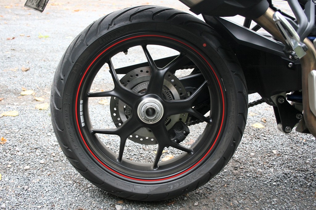 Die Triumph Tiger Sport Bereifung: 120/70 ZR 17 (vorne), 180/55 ZR 17 (hinten). Foto: Auto-Medienportal.Net