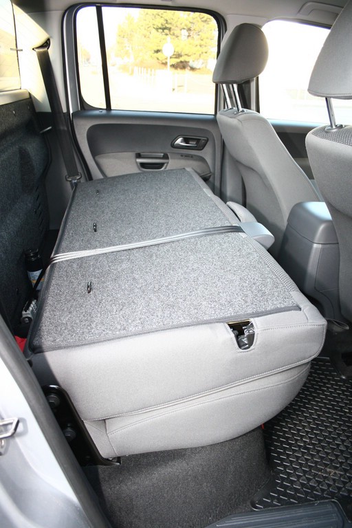 VW Amarok – Nach dem Umklappen der Rückenlehnen entsteht eine üppige Ablagefläche für Gepäck oder Material. Foto: Auto-Medienportal.Net