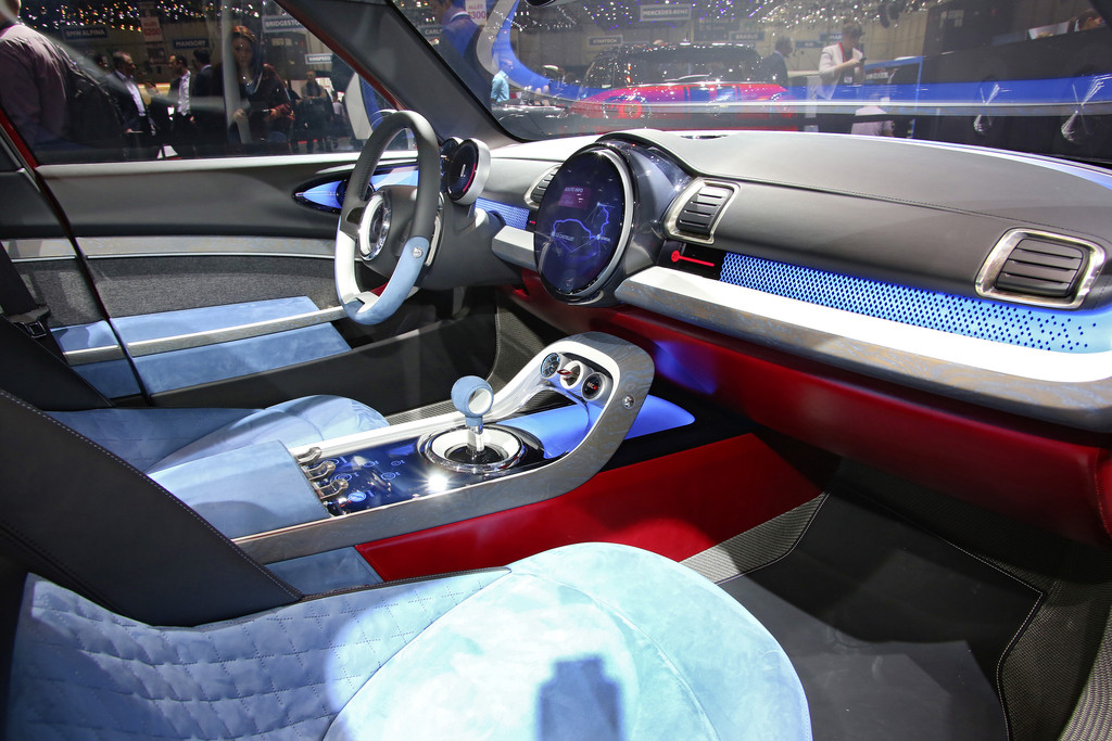 Mini Clubman Concept – Das Interieur präsentiert sich in Leder, Twill und Tweed. Kleine Details, wie mit dem Union Jack geprägte Knöpfe an Sitzen und Mittelkonsole, Kontrastnähte, Keder oder rote Akzentflächen in den Sonnenblenden, die nur zum Vorschein kommen, wenn man die Blenden herunterklappt, verleihen dem Clubman Concept eine besondere Note. Foto: Auto-Medienportal.Net/Manfred Zimmermann