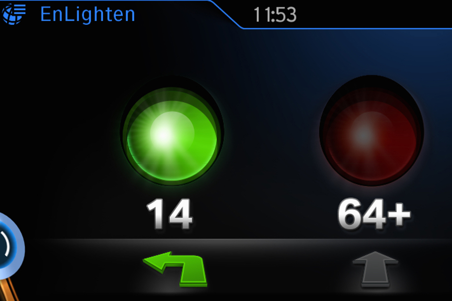 Die BMW Group plant, als erster Hersteller eine ‚Enlighten-App‘ ins Auto zu bringen. Sie versetzt die Fahrenden mit iOS-Geräten in Verbindung mit BMW Connected Drive in die Lage, Verkehrssignaldaten auf dem Display des Fahrzeugs in Echtzeit zu sehen – beginnend in den USA. Die App signalisiert den aktuellen Status der Ampel weit vor dem Auto in Echtzeit und zeigt einen Countdown an, wann das Signal umschalten wird. Auf Basis der aktuellen Fahrzeugposition sowie der Fahrgeschwindigkeit bietet die App eine Empfehlung, ob das Grünlicht der Ampel noch im Rahmen der Vorschriften zu erreichen ist oder frühzeitig das Tempo zu drosseln, weil man ohnehin wegen Rotlichts anhalten muss. Ein Audio-Alarm informiert den Fahrer während der Annäherung über eine bevorstehende Signaländerung. Anhand des Blinkersignals wird die Absicht des Fahrenden erkannt, so dass nur streckenrelevante Angaben angezeigt werden.