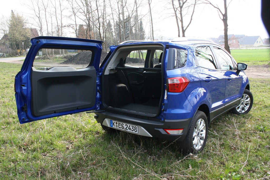 Ford Ecosport 1.0 l Ecoboost – Bei der ersten Begegnung dauert es etwas, bis der Griff zum Öffnen des Kofferraums gefunden ist. Er steckt stilsicher in der rechten Heckleuchteneinheit, dort, wo auf der linken Seite der Rückscheinwerfer platziert ist. Die raumgreifend aufschwingende Hecktür macht schon was her, dürfte aber im urbanen Großstadtdschungel häufiger an ihre Grenzen stoßen. Foto: Auto-Medienportal.Net