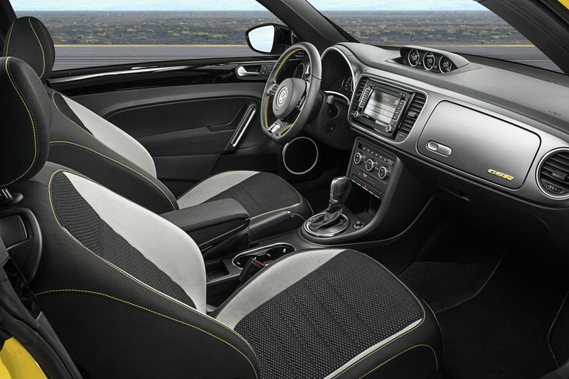 Im schwarz-gelben Interieur des GSR von einst sorgten ein Sportlederlenkrad und Sportsitze für ein Plus an Käfer-Dynamik. Vier Jahrzehnte später sind es ergonomisch ausgefeilte R-Line-Sportsitze mit Stoffbezügen und gelben Kontrastnähten (US-Version mit schwarzer Lederausstattung), ein griffiges Ledersportlenkrad (ebenfalls gelbe Kontrastnähte) mit R-Line-Logo und eine Limited-Edition-Plakette mit der Sonderseriennummer (1 bis 3500), die den GSR besonders auszeichnen. Foto: Auto-Medienportal.Net/Volkswagen