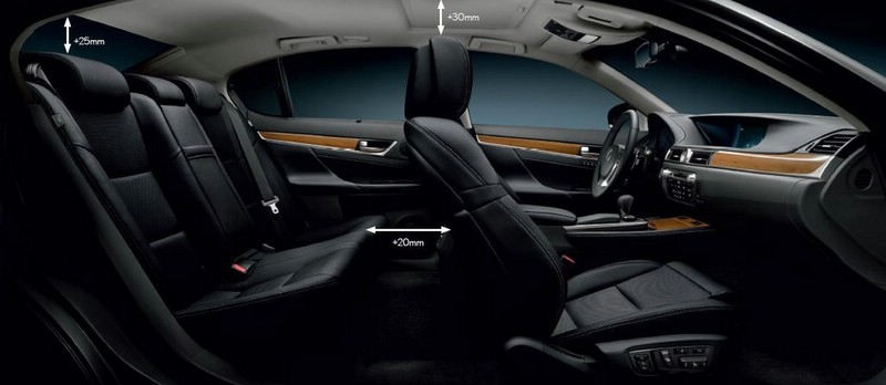 Der Innenraum des neuen Lexus GS – In Verbindung mit einer ebenfalls vergrößerten Sitzhöhenverstellung ergibt sich nicht nur mehr Beinfreiheit, sondern auch bis zu 30 Millimeter mehr Kopffreiheit. Foto: Auto-Medienportal.Net/Lexus