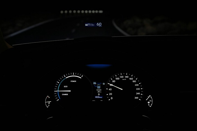 Lexus GS 450h – Überarbeitet wurde auch das Head-up-Display. Es bietet weiter verbesserte Lesbarkeit und zusätzliche Funktionen. So werden nicht nur die Fahrgeschwindigkeit oder Daten zum Audio- und Navigationssystem direkt in das Blickfeld des Fahrers projiziert, sondern erstmals auch die Motordrehzahl und die Eco-Anzeige. Foto: Auto-Medienportal.Net/Lexus