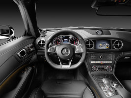 Minimale Spaltmaße und vollflächig hinterschäumte Bordkanten sind zwei Indizien für den Anspruch, den der SL auch im Innenraum verkörpert. Das Oberteil der Instrumententafel bildet eine Einheit mit den Bordkanten der Türen. Die zwölf Bedientasten des Drei-Speichen-Sportlenkrads erlauben den Zugriff auf die Menüführung im Kombiinstrument sowie auf Audiosystem, Telefon und Spracheingabe. Das Kombiinstrument in Zwei-Tuben-Optik vereint klassische Rundinstrumente mit moderner Display-Technik. Ziffernblätter und Zeiger sind neu gestaltet. In der Mittelkonsole findet wieder eine – aufpreispflichtige – Analoguhr. Auf dem Mediadisplay werden Fahrdaten wie Längs- und Querbeschleunigungen (in einem G-Force-Kreuz) oder Drehmoment und Leistung dargestellt