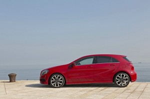Mercedes-Benz A-Klasse – An der Seite sprechen Schweller, Charakterlinie von der Scheinwerferecke bis zum Heck und die deutlich ansteigende Sicke an der Seite, die in breiten Schultern endet, unterstreichen den dynamischen Auftritt wie die niedrigen Fensterflächen an der Seite und hinten. Foto: Auto-Medienportal.Net/Daimler