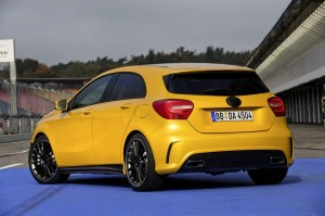 Mercedes A45 AMG: Der neue Motor mit zwei Litern Hubraum entwickelt etwa 350 PS und ein maximales Drehmoment von 450 Newtonmetern. Das klingt nach mächtigem Spurtvermögen, auch wegen des Doppelkupplungsgetriebes. Der Kleine lässt’s ganz schön krachen. Foto: Auto-Medienportal.Net/Daimler