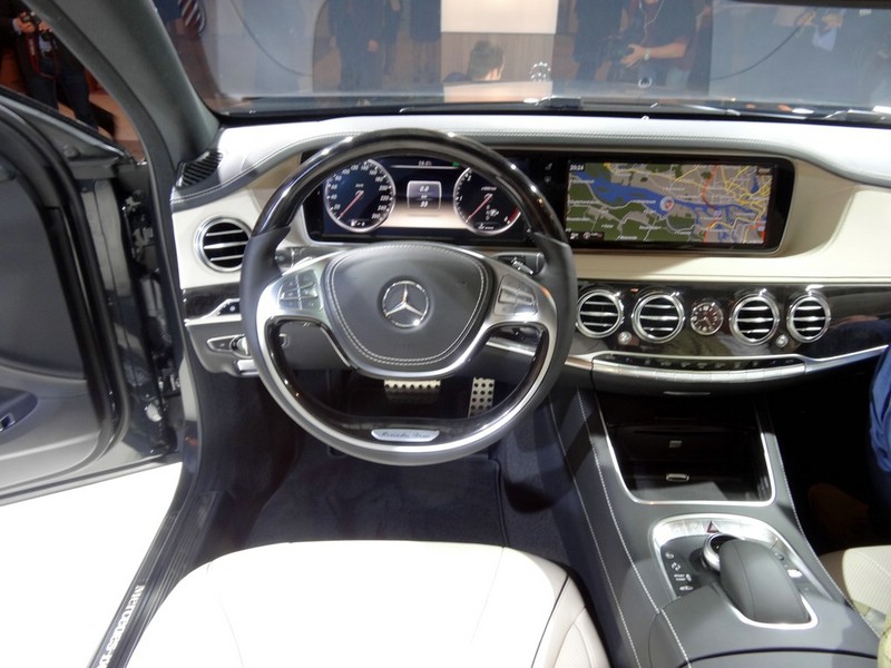 Das Armaturenbrett vor einem wächst in die Breite, umfasst in einer sanften Rundung Fahrer und Beifahrer und schließt auch die hinteren Passagiere noch in die S-Welt ein – alles gediegene Materialien, gut anzuschauen und anzufassen. Dafür gibt es für ein Auto dieser Klasse erstaunlich wenige Bedienelemente; denn fast alles lässt sich über Menüs steuern, angezeigt auf dem riesig breiten Bildschirm über der Mittelkonsole oder zwischen den beiden virtuellen Rundinstrumenten auf dem Bildschirm im Blickfeld des Fahrers. Foto: Auto-Medienportal.Net/Daimler