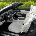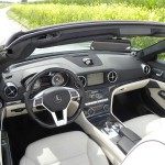 Erst kürzlich zeichnete der Rat für Gestaltung sowohl das Äußere als auch für die Innenraumgestaltung aus. Über letztere lässt sich Ähnliches sagen wie über die Außengestaltung, nur strahlt der SL innen mehr Luxus aus als außen. Belederte Armaturentafel, chromumrandete Ausströmer, das Drei-Speichen-Lenkrad mit Multifunktionstasten und Schaltpaddeln, die beiden Rundinstrumente im Chronographen-Look – das alles bringt gerade die rechte Mischung zwischen Gestern und Morgen. Steigt man tiefer ein, findet man mehr vom Morgen; denn alle elektronischen Helferlein, die Mercedes-Benz bietet, lassen sich über das Command Online-System auf den Bildschirm in der Mittelkonsole bringen und steuern. LED-Scheinwerfer samt dem Intelligent Light System, die Sieben-Gang-Automatik, das Command System und eine Polsterung mit einer Stoff-und Lederausstattung in Schwarz gehören zur angemessen umfangreichen Serienausstattung.