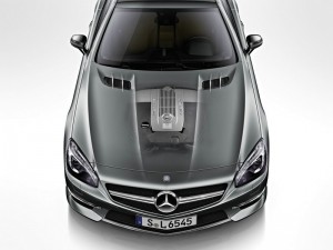 Mercedes-Benz SL 65 AMG 45th Anniversary – Exklusiv für das Jubelexemplar ist das Exterieur Carbon-Paket in mattem Finish. Die Querstrebe in der Frontschürze, die Außenspiegel und die Abrisskante sind in Carbon ausgeführt, das mit einer seidenmatten Oberfläche versehen ist. Im gleichen Look präsentiert sich der AMG 6,0-Liter-V12-Biturbomotor. Dessen hochwertige Motorabdeckung besteht aus mattem Carbon und Aluminium. Foto: Auto-Medienportal.Net/Daimler