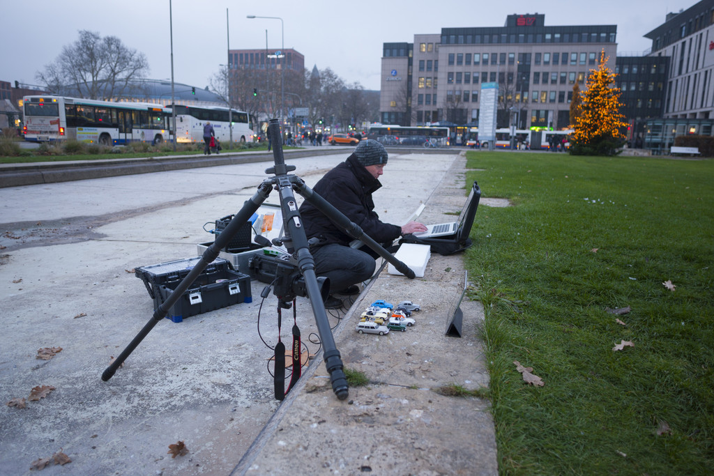 Modellauto Opel Adam (1:43) von Fotograf Axel Wierdemann in Szene gesetzt: Wo sich sonst im Sommer die Zuschauer auf dem Grüngelände vor dem Wiesbadener Hauptbahnhof zum Open-Air-Kino versammeln, findet nun das Micro-Opel-Air-Autokino mit Tablet-Computer als Kinoleinwand statt.