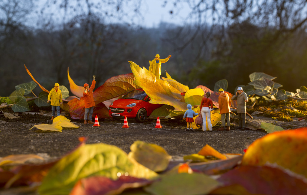 Modellauto Opel Adam (1:43) von Fotograf Axel Wierdemann in Szene gesetzt: Nichts geht mehr für den knallroten Opel. Herabfallende Herbstblätter haben ihm eine natürliche „Garage“ gebaut, aus der er ohne fremde Hilfe nicht mehr herauskommt. Um diese wahrhaft verfahrene Situation herzustellen, waren viel Fingerspitzengefühl und der Einsatz der richtigen Hilfsmittel gefragt. Per Pinzette wurden Blätter, Figuren und Pylonen drapiert. Doch ein Windhauch genügt, und die umherstehenden Personen liegen auf dem Rücken…
