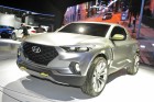 Neben fünf Sitzen hat der viertürige Santa Cruz auch eine gedeckelte Ladefläche, deren Boden sich wie eine Schublade herausziehen lässt. So lassen sich auch lange, sperrige Gegenstände wie etwa Surfboards leicht laden und transportieren. In seiner Optik zitiert der Hyundai Santa Cruz Concept seine großen Pick-up-Vorbilder mit breiter Spur, fetter Kühlermaske, rustikaler Seitenansicht und hohen Rädern.