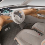 Die Türen des Konzeptfahrzeugs schwingen gegenläufig auf und sind innen als skulpturale Flächen mit hellem Holz und bläulichem Acryl verkleidetr. Als obere Begrenzung schließt sich ein Metallrahmen an, der die gesamte Kabine auf Schulterhöhe umzieht. Das Aufeinandertreffen von Holz und Metall setzt sich am Armaturenträger fort.