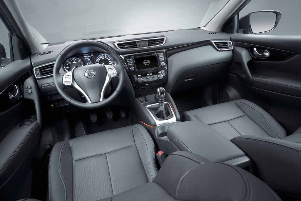 Nissan Qashqai Innenraum – In der Basisversion Visia gehören unter anderem Klimaanlage, Bluetooth-Freisprecheinrichtung, Berganfahrhilfe, LED-Tagfahrlicht und ein farbiger, hochauflösender Fünf-Zoll-Infotainment-Bildschirm zum Serienumfang. Für die Sicherheit sorgen serienmäßig sechs Airbags, ein Reifendruckkontrollsystem, eine Geschwindigkeitsregelanlage und die neuen Fahrwerkskontroll-Features (Chassis Control Technology). Foto: Auto-Medienportal.Net/Nissan