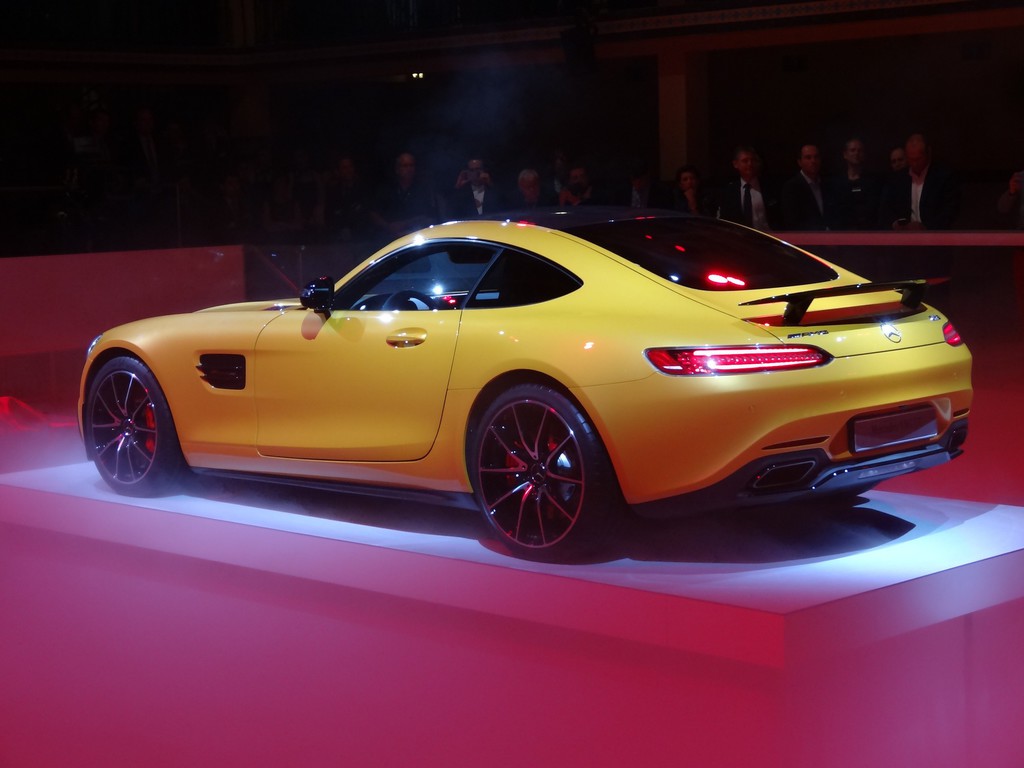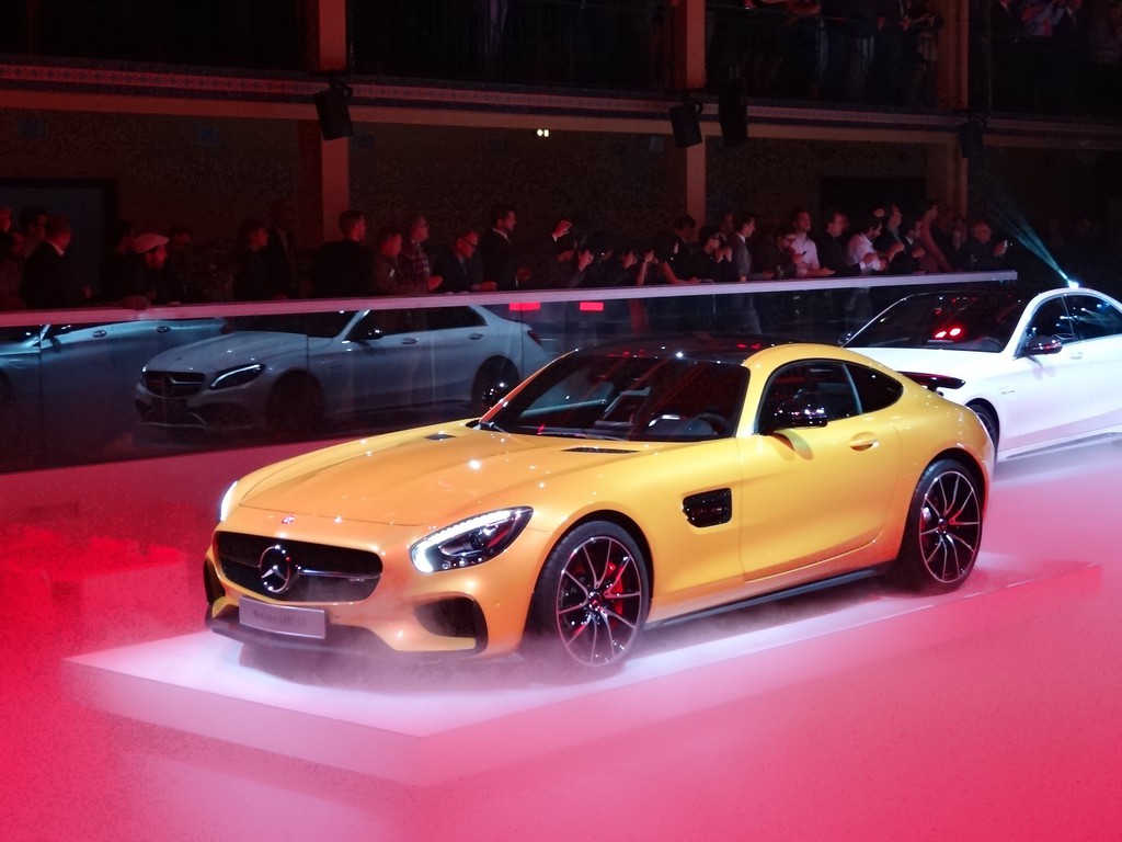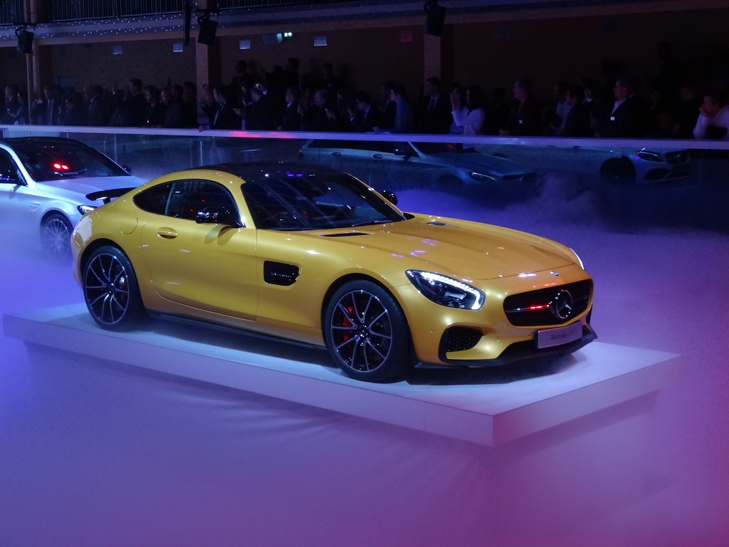 Star des Abends war ganz sicher der deutlich gelbe Mercedes-Benz AMG GT, der in Paris zum ersten Mal einem breiten Publikum gezeigt wird. Mit den zwei Leistungsstufen seines neuen Achtzylindern-Twinturbo mit entweder 340 kW / 426 PS oder 375 kW / 510 PS und einem Leistungsgewicht bei der stärksten Version von 3,08 kg pro PS soll antreten und zum meistbegehrten Sportauto auf der Welt werden. Maranello und Zuffenhausen werden es längst gehört haben.