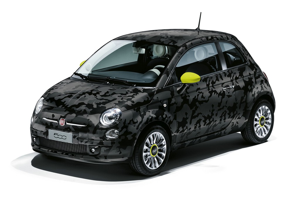 Die Studie Fiat 500 Camouflage kommt mit einem modischen Tarnmuster in Grau und Grün. Fluoreszierend gelbe Abdeckkappen der Außenspiegel bilden den Kontrast. Foto: FCA/dpp-AutoReporter