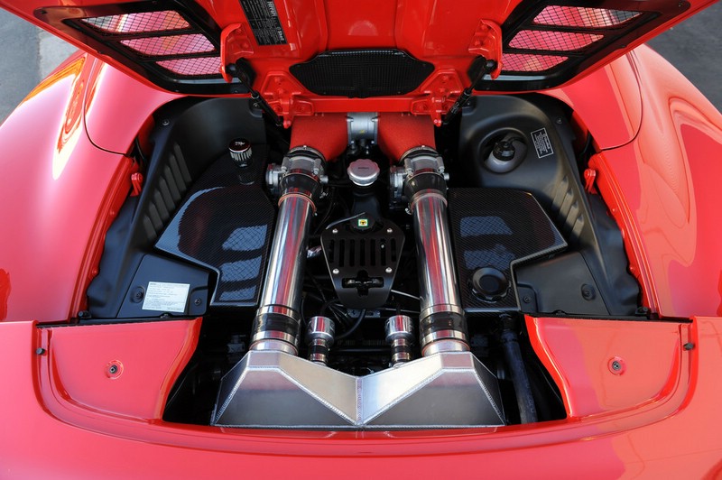 Ferrari 458 HPE 700 Twin Turbo – Im Motorraum findet sich der 4,5-Liter-V8 nun zwischen zwei Turboladern wieder und darf bis 9000 U/min drehen. Die Lader stellen bei dieser Drehzahl ihre Leistung im folgenden Gang des 7-Gang-Doppelkupplungsgetriebes nahtlos zur Verfügung. Die Kühlung der mit Edelstahl angeschlossenen Turbolader erfolgt mittels Wärmetauscher und zwei elektrischen Lüftern. Foto: Auto-Medienportal.Net/Hennessey Performance