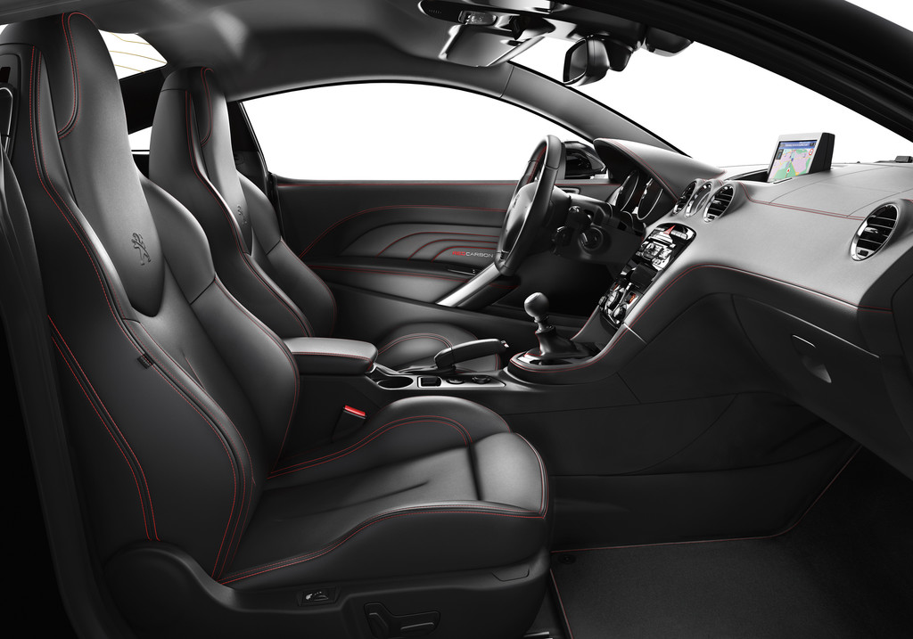 Peugeot RCZ Sondermodell Red Carbon: Die Integralsitze vorne sind elektrisch beheiz- und verstellbar, ihre besonders feine Anmutung resultiert aus tiefroten Ziernähten, die sich über die Türverkleidungen bis ins Armaturenbrett erstrecken, an Mittelarmlehne und Fußmatten wiederfinden sowie Lenkrad und Schaltknauf veredeln. Beide entstammen dem Sport-Paket und ermöglichen dem Fahrer mit nur 362 Millimetern Durchmesser bzw. einem verkürzten Griff, den lustvollen Löwen präzise zu dirigieren. Foto: Auto-Medienportal.Net/Peugeot