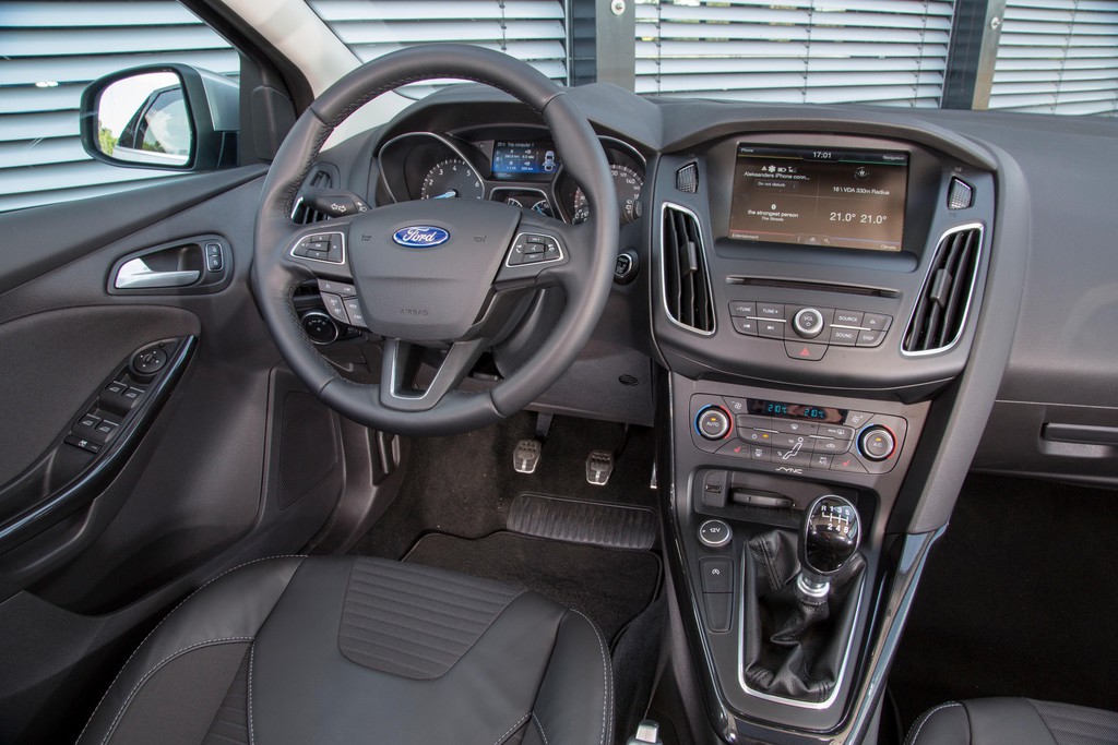 Weit augenfälliger als das Exterieur sind die Änderungen im Focus-Innenraum, wobei die Gestalter nach eigener Auskunft den Wünschen der Kunden folgten: weniger verwirrende Bedienelemente und Schalter, dafür viel Schwarz und einige Chromdetails, die zu einem sauberen, modernen Look und mehr logischen und intuitiven Funktionen beitragen. Im Zentrum zwischen Fahrer und Beifahrer bietet eine neue Ablagekonsole mit Schiebedeckel gleichzeitig sowohl Ablagefläche für den Unterarm als auch eine Menge Platz für Flaschen und anderen Krimskrams. Foto: Auto-Medienportal.Net/Ford