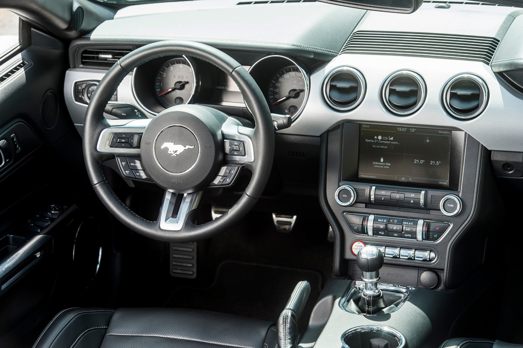 Das Lenkrad nimmt die Gestaltung alter Mustangs wieder auf, bei denen der dünne, große Kranz auf einer Art Trichter aus den Speichen ruht. Nur greift man hier nicht nach dem Bakelit-Lenkrad der Vergangenheit, sondern nach einem besonders kleinen Lederlenkrad mit einem dicken Kranz. Der liegt gut in der Hand, verdeckt aber weite Sektoren der beiden Rundinstrumente im Blickfeld des Fahrers.