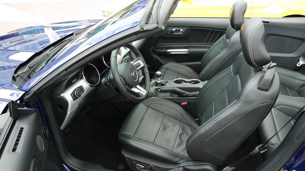 Im Innenraum waren Pony Cars und eben auch der Mustang traditionell immer ein bisschen schlichter gehalten, was seine Freunde als Purismus lobten und andere ein wenig simpel fanden. Mit dieser Vergangenheit hat man bei Ford gebrochen, wenn auch ganz vorsichtig. Was man erlebt, ist ein sportliches Ambiente, das sogar den Anschein von Luxus erweckt, der allerdings durch die Materialwahl gedämpft wird. Was gut aussieht, kann auch Kunststoff sein.