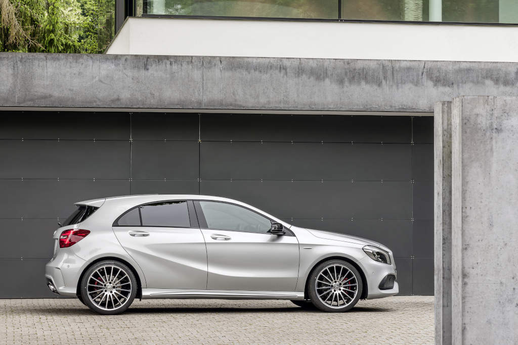 Auch der Mercedes-AMG A 45 4Matic profitiert von der Modellpflege. Mit seinen 21-Zusatz-PS beschleunigt er jetzt aus dem Stand in 4,2 Sekunden von 0 auf 100 km/h, vier Zehntelsekunden schneller als sein Vorgänger. Dabei konnte das Verbrauchsniveau gehalten werden: Den NEFZ-Durchschnittswert von 6,9 Liter je 100 Kilometer (entspricht 162 g/km CO2) erreicht kein anderes High-Performance-Fahrzeug in dieser Klasse.