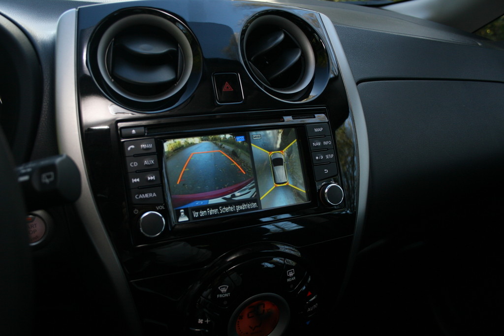 Nissan Note – Das Interieur ist ebenfalls ansprechend gestaltet. Stoffbespannte Türinnenseite und ein blauer Leuchtbogen über der Instrumentenanzeige werten neben der inzwischen fast schon obligatorischen Klavierlackoptik der Mittelkonsole das Ambiente auf. Foto: Auto-Medienportal.Net