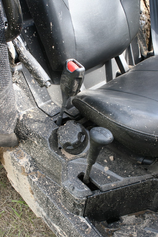 Polaris Sportsman Ace: Wählhebel der Automatik, Tankverschluss, Gurtschloss und Handbremse. Foto: Auto-Medienportal.Net
