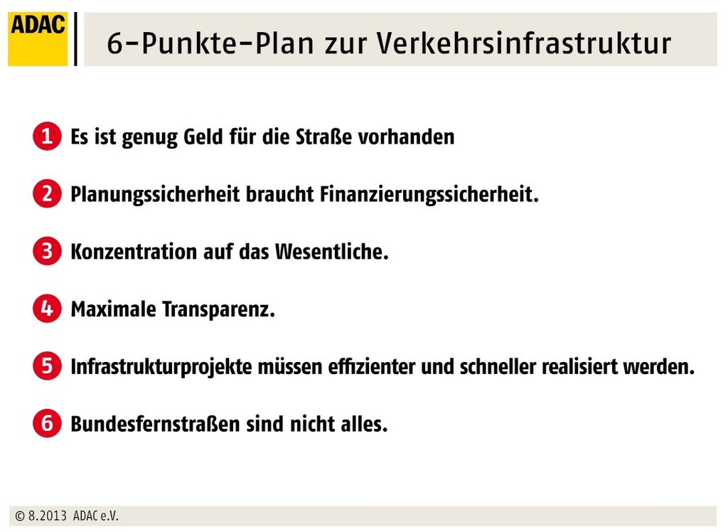 Zwingend notwendig ist nach Ansicht des ADAC, einen Teil der von den Autofahrern bereits geleisteten Abgaben zweckgebunden für den Erhalt und den Ausbau der Straßeninfrastruktur zu verwenden. Diese Forderung ist Kern eines 6-Punkte-Plans, der heute vorgestellt wurde. Darin fordert der Club außerdem, dass finanzielle Zusagen für Infrastrukturprojekte mehrjährig und verbindlich sein müssen. Im Fokus künftiger Infrastrukturpolitik sollten der Erhalt von Straßen und Brücken sowie die Engpassbeseitigung chronisch überlasteter Autobahnen stehen.