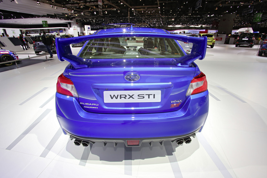 Der hintere Stoßfänger mit integriertem Diffusor und die beiden doppelten Auspuffendrohre sollen den tiefen Schwerpunkt des WRX-STI herausstellen. Der große Heckflügel ist dem Topmodell der WRX-STI-Serie vorbehalten. Foto: Auto-Medienportal.Net/Manfred Zimmermann