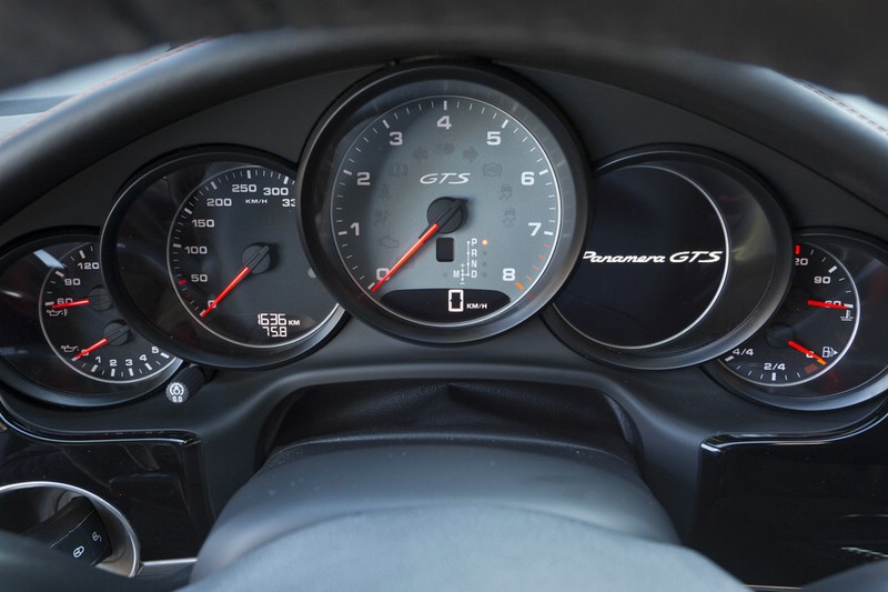 Porsche Panamera GTS – Die Sportsitze, das Sportlenkrad, die drei Rundinstrumente mit dem Drehzahlmesser in der Mitte und die mächtige Mittelkonsole mit dem großen Tastenfeld auf dem Tunnel prägen auch den GTS. Foto: Auto-Medienportal.Net/Porsche